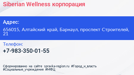 Siberian Wellness, корпорация по адресу 656015, Алтайский край, Барнаул, проспект Строителей, 21 в дальнейшем Организация, размещена в следующих категориях: