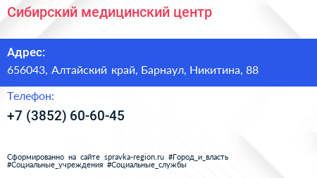 Сибирский медицинский центр по адресу 656043, Алтайский край, Барнаул, Никитина, 88 в дальнейшем Организация, размещена в следующих категориях:
