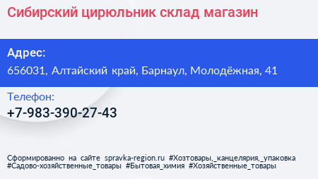 Сибирский цирюльник, склад-магазин по адресу 656031, Алтайский край, Барнаул, Молодёжная, 41 в дальнейшем Организация, размещена в следующих категориях: