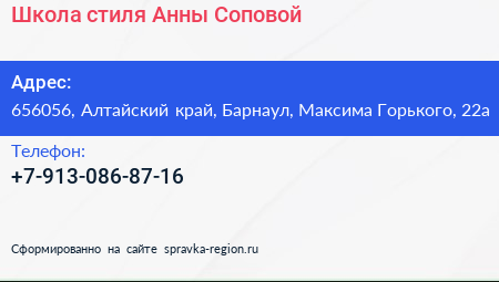 Школа стиля Анны Соповой по адресу 656056, Алтайский край, Барнаул, Максима Горького, 22а в дальнейшем Организация, размещена в следующих категориях:
