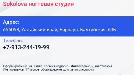 Sokolova, ногтевая студия по адресу 656058, Алтайский край, Барнаул, Балтийская, 63Б в дальнейшем Организация, размещена в следующих категориях: