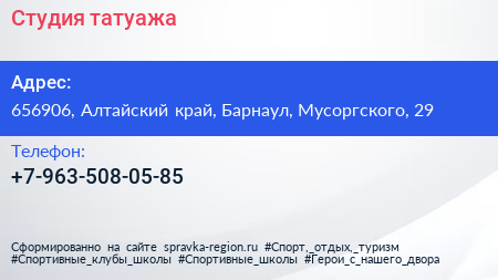 Студия татуажа по адресу 656906, Алтайский край, Барнаул, Мусоргского, 29 в дальнейшем Организация, размещена в следующих категориях: