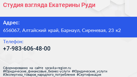 Студия взгляда Екатерины Руди по адресу 656067, Алтайский край, Барнаул, Сиреневая, 23 к2 в дальнейшем Организация, размещена в следующих категориях: