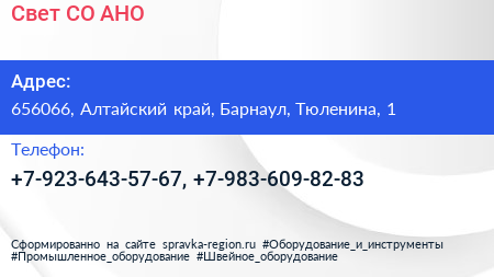 Свет, СО АНО по адресу 656066, Алтайский край, Барнаул, Тюленина, 1 в дальнейшем Организация, размещена в следующих категориях: