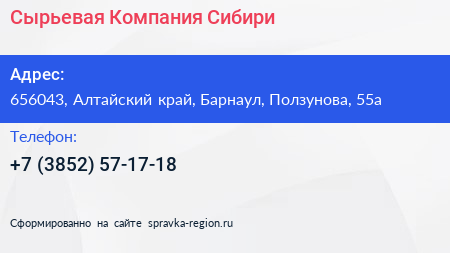Сырьевая Компания Сибири по адресу 656043, Алтайский край, Барнаул, Ползунова, 55а в дальнейшем Организация, размещена в следующих категориях: