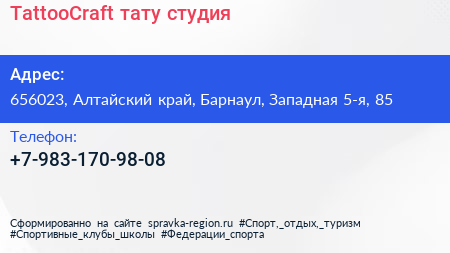 TattooCraft, тату-студия по адресу 656023, Алтайский край, Барнаул, Западная 5-я, 85 в дальнейшем Организация, размещена в следующих категориях: