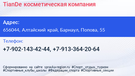 TianDe, косметическая компания по адресу 656044, Алтайский край, Барнаул, Попова, 55 в дальнейшем Организация, размещена в следующих категориях: