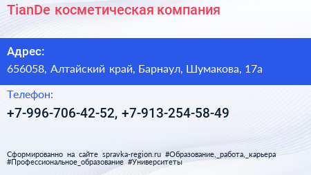 TianDe, косметическая компания по адресу 656058, Алтайский край, Барнаул, Шумакова, 17а в дальнейшем Организация, размещена в следующих категориях: