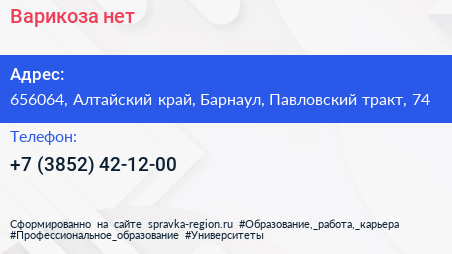 Варикоза нет по адресу 656064, Алтайский край, Барнаул, Павловский тракт, 74 в дальнейшем Организация, размещена в следующих категориях: