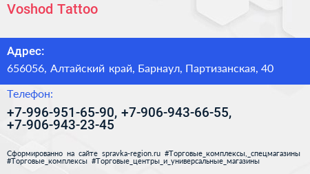 Voshod Tattoo по адресу 656056, Алтайский край, Барнаул, Партизанская, 40 в дальнейшем Организация, размещена в следующих категориях: