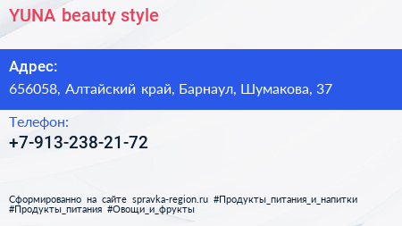 YUNA beauty style по адресу 656058, Алтайский край, Барнаул, Шумакова, 37 в дальнейшем Организация, размещена в следующих категориях: