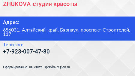 ZHUKOVA, студия красоты по адресу 656031, Алтайский край, Барнаул, проспект Строителей, 117 в дальнейшем Организация, размещена в следующих категориях: