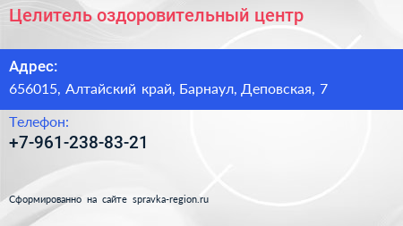 Целитель, оздоровительный центр по адресу 656015, Алтайский край, Барнаул, Деповская, 7 в дальнейшем Организация, размещена в следующих категориях: