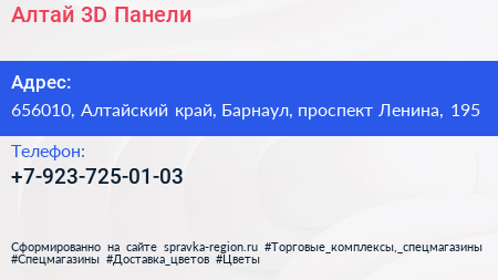 Алтай 3D Панели по адресу 656010, Алтайский край, Барнаул, проспект Ленина, 195 в дальнейшем Организация, размещена в следующих категориях: