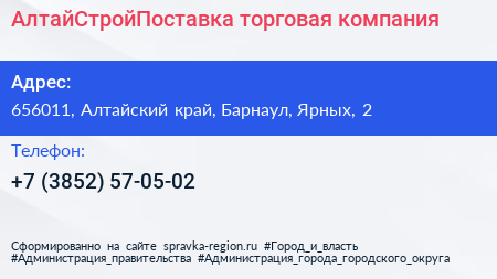 АлтайСтройПоставка, торговая компания по адресу 656011, Алтайский край, Барнаул, Ярных, 2 в дальнейшем Организация, размещена в следующих категориях: