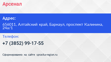 Арсенал по адресу 656011, Алтайский край, Барнаул, проспект Калинина, 24а/1 в дальнейшем Организация, размещена в следующих категориях: