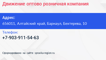 Движение, оптово-розничная компания по адресу 656011, Алтайский край, Барнаул, Бехтерева, 10 в дальнейшем Организация, размещена в следующих категориях: