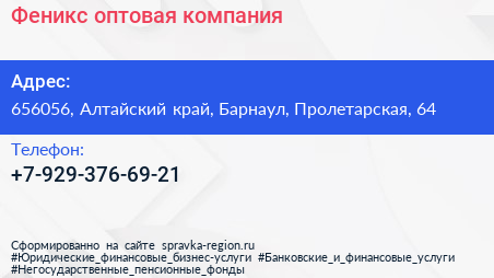 Феникс, оптовая компания по адресу 656056, Алтайский край, Барнаул, Пролетарская, 64 в дальнейшем Организация, размещена в следующих категориях: