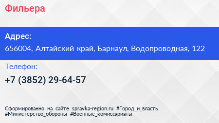 Фильера по адресу 656004, Алтайский край, Барнаул, Водопроводная, 122 в дальнейшем Организация, размещена в следующих категориях: