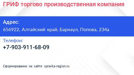ГРИФ, торгово-производственная компания по адресу 656922, Алтайский край, Барнаул, Попова, 234а в дальнейшем Организация, размещена в следующих категориях: