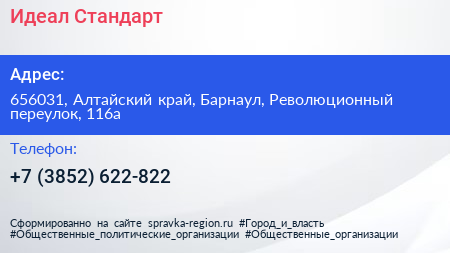Идеал-Стандарт по адресу 656031, Алтайский край, Барнаул, Революционный переулок, 116а в дальнейшем Организация, размещена в следующих категориях: