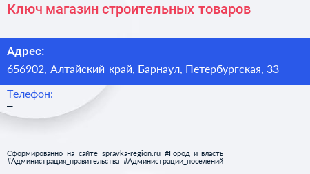Ключ, магазин строительных товаров по адресу 656902, Алтайский край, Барнаул, Петербургская, 33 в дальнейшем Организация, размещена в следующих категориях: