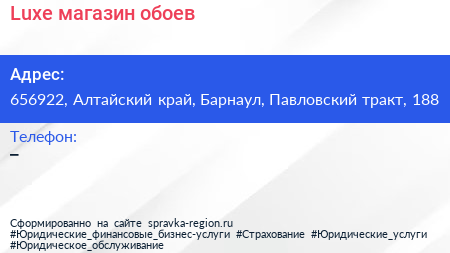 Luxe, магазин обоев по адресу 656922, Алтайский край, Барнаул, Павловский тракт, 188 в дальнейшем Организация, размещена в следующих категориях: