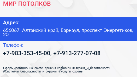МИР ПОТОЛКОВ по адресу 656067, Алтайский край, Барнаул, проспект Энергетиков, 20 в дальнейшем Организация, размещена в следующих категориях:
