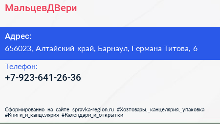 МальцевДВери по адресу 656023, Алтайский край, Барнаул, Германа Титова, 6 в дальнейшем Организация, размещена в следующих категориях: