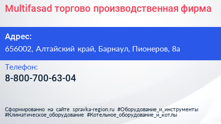 Multifasad, торгово-производственная фирма по адресу 656002, Алтайский край, Барнаул, Пионеров, 8а в дальнейшем Организация, размещена в следующих категориях: