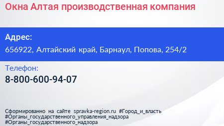 Окна Алтая, производственная компания по адресу 656922, Алтайский край, Барнаул, Попова, 254/2 в дальнейшем Организация, размещена в следующих категориях:
