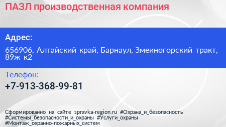 ПАЗЛ, производственная компания по адресу 656906, Алтайский край, Барнаул, Змеиногорский тракт, 89ж к2 в дальнейшем Организация, размещена в следующих категориях: