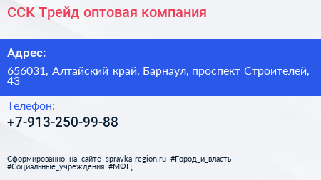 ССК-Трейд, оптовая компания по адресу 656031, Алтайский край, Барнаул, проспект Строителей, 43 в дальнейшем Организация, размещена в следующих категориях: