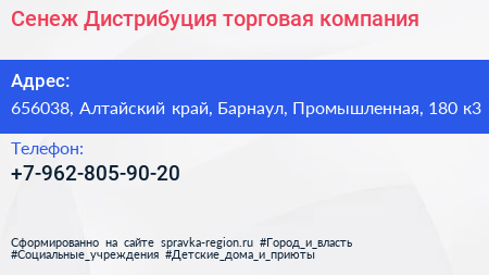Сенеж-Дистрибуция, торговая компания по адресу 656038, Алтайский край, Барнаул, Промышленная, 180 к3 в дальнейшем Организация, размещена в следующих категориях: