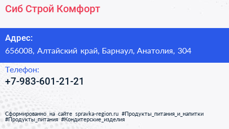 Сиб-Строй-Комфорт по адресу 656008, Алтайский край, Барнаул, Анатолия, 304 в дальнейшем Организация, размещена в следующих категориях: