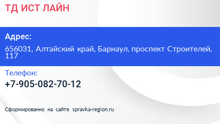 ТД ИСТ ЛАЙН по адресу 656031, Алтайский край, Барнаул, проспект Строителей, 117 в дальнейшем Организация, размещена в следующих категориях: