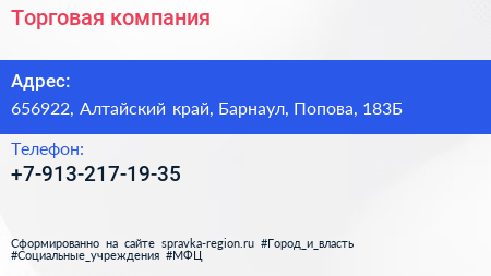 Торговая компания по адресу 656922, Алтайский край, Барнаул, Попова, 183Б в дальнейшем Организация, размещена в следующих категориях: