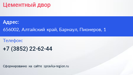 Цементный двор по адресу 656002, Алтайский край, Барнаул, Пионеров, 1 в дальнейшем Организация, размещена в следующих категориях: