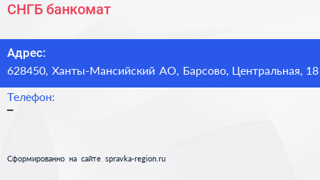 СНГБ, банкомат по адресу 628450, Ханты-Мансийский АО, Барсово, Центральная, 18 в дальнейшем Организация, размещена в следующих категориях: