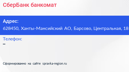 СберБанк, банкомат по адресу 628450, Ханты-Мансийский АО, Барсово, Центральная, 18 в дальнейшем Организация, размещена в следующих категориях: