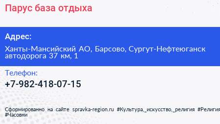 Парус, база отдыха по адресу Ханты-Мансийский АО, Барсово, Сургут-Нефтеюганск автодорога 37 км, 1 в дальнейшем Организация, размещена в следующих категориях:
