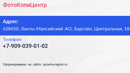 ФотоКопиЦентр по адресу 628450, Ханты-Мансийский АО, Барсово, Центральная, 18 в дальнейшем Организация, размещена в следующих категориях: