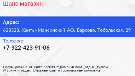 Шанс, магазин по адресу 628328, Ханты-Мансийский АО, Барсово, Тобольская, 29 в дальнейшем Организация, размещена в следующих категориях: