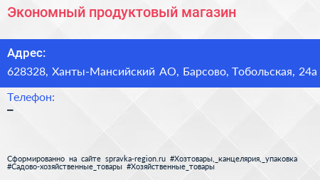 Экономный, продуктовый магазин по адресу 628328, Ханты-Мансийский АО, Барсово, Тобольская, 24а в дальнейшем Организация, размещена в следующих категориях: