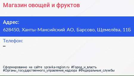 Магазин овощей и фруктов по адресу 628450, Ханты-Мансийский АО, Барсово, Щемелёва, 11Б в дальнейшем Организация, размещена в следующих категориях: