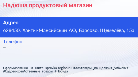 Надюша, продуктовый магазин по адресу 628450, Ханты-Мансийский АО, Барсово, Щемелёва, 15а в дальнейшем Организация, размещена в следующих категориях: