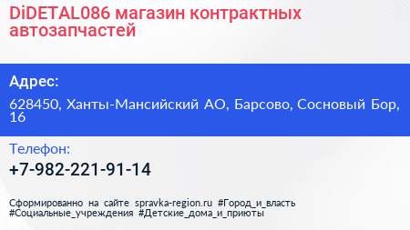 DiDETAL086, магазин контрактных автозапчастей по адресу 628450, Ханты-Мансийский АО, Барсово, Сосновый Бор, 16 в дальнейшем Организация, размещена в следующих категориях: