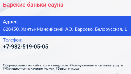 Барские баньки, сауна по адресу 628450, Ханты-Мансийский АО, Барсово, Белорусская, 1 в дальнейшем Организация, размещена в следующих категориях: