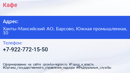 Кафе по адресу Ханты-Мансийский АО, Барсово, Южная промышленная, 10 в дальнейшем Организация, размещена в следующих категориях:
