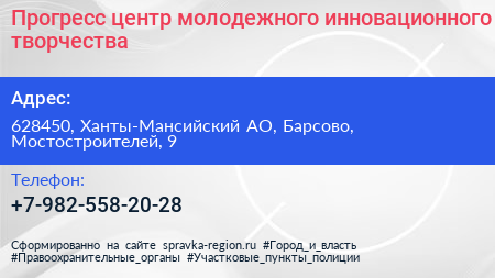 Прогресс, центр молодежного инновационного творчества по адресу 628450, Ханты-Мансийский АО, Барсово, Мостостроителей, 9 в дальнейшем Организация, размещена в следующих категориях: